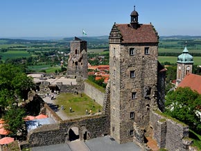 Das Burgmuseum betrachtet das Baudenkmal Burg Stolpen als erstes Exponat. Der gesamte Außenbereich kann durchlaufen werden. Der Rundgang beginnt in den jüngsten Teilen der Veste, den neuzeitlichen Festungswerken mit dem Torhaus. Die Kornhausdurchfahrt gibt den Blick auf das Hauptportal frei. Nun dominieren die freistehenden Türme die Silhouette. Grandios ist die Fernsicht aus dem ältesten Teil der Burganlage auf die umgebende Landschaft. Über die Sächsische Schweiz bis nach Böhmen geht der Blick.