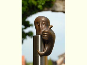 Seit einiger Zeit ist der Burggeist eine offizielle Person in der Stadt. Wenn auch nicht leibhaftig lebendig, sondern als Bronzeguss. Dafür recht zahlreich. Beginnend an den Parkplätzen an der Peripherie der Stadt empfängt er die Stolpener Gäste als Stadtführer. Auf einer Stele sitzend weist er, drehbar gelagert, über seinen Daumen den Suchenden den Weg. Wind und Wetter sind ihm einerlei. Er weiß, in Stolpen geht’s bergauf. Hier ist man dem Himmel ein Stück näher, hier fühlt er sich wohl. Und oben auf der Burg ist er zu Hause.